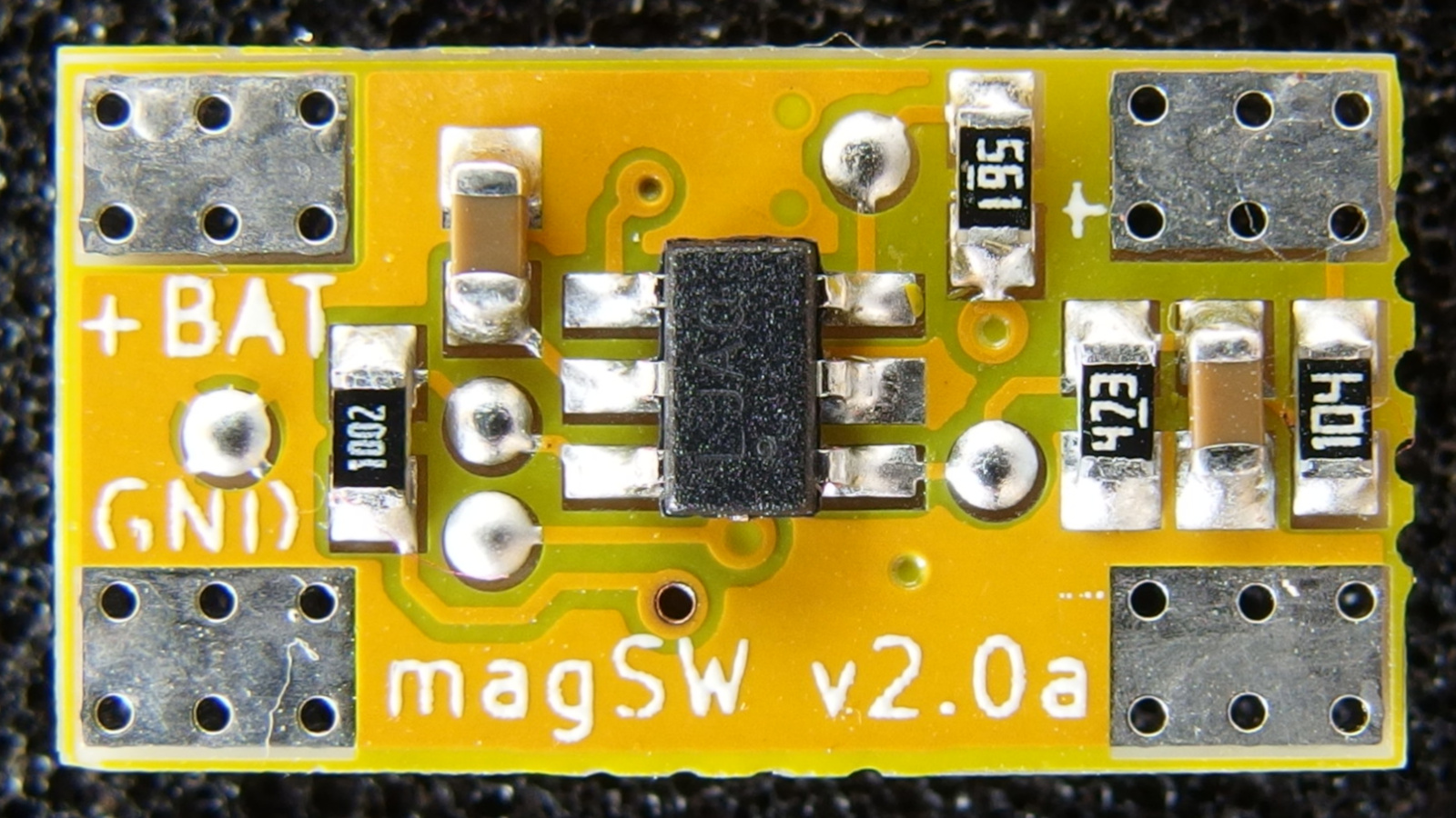 I have had this one in mind since I worked on the previous v10a version. MagSW v20a is an extended variant of the MagSW v10a. The v20a uses a tiny microcontroller instead of the D-type flip-flop for the switch memory. The rest of the circuit remains identical. Adding a small microcontroller to the system was extremely tempting. The microcontroller allows for features which are difficult to implement without it. The key and only difference in functionality between the MagSW v10a and MagSW v20a is that the latter monitors the onboard voltage and signalizes its minimal detected level through the LED (aka brownout detection). More on this later.